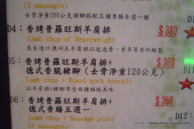 菜色方面,店家有規劃出許多雙人的套餐,價位約在$600~$730間,比起單點兩份單人餐會便宜一點,需收10%服務費,另外店家也有在做德國豬腳與香腸的外帶生意。